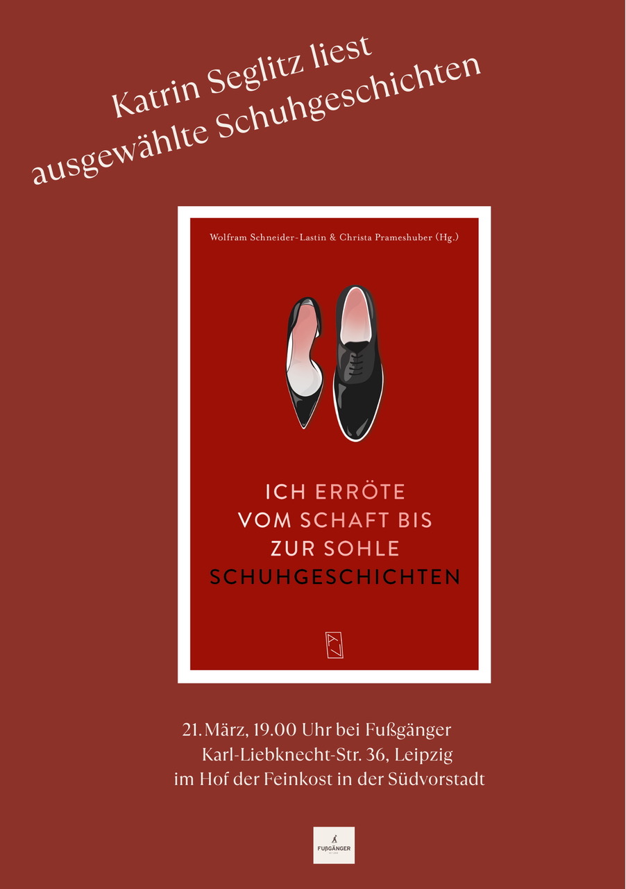 Im Rahmen der Leipziger Buchmesse stelle ich am 21. März um 19:00 Uhr das Buch "Schuhgeschichten" im Schuhgeschäft "Fußgänger" vor, Karl-Liebknecht-Str. 36, 04107 Leipzig.